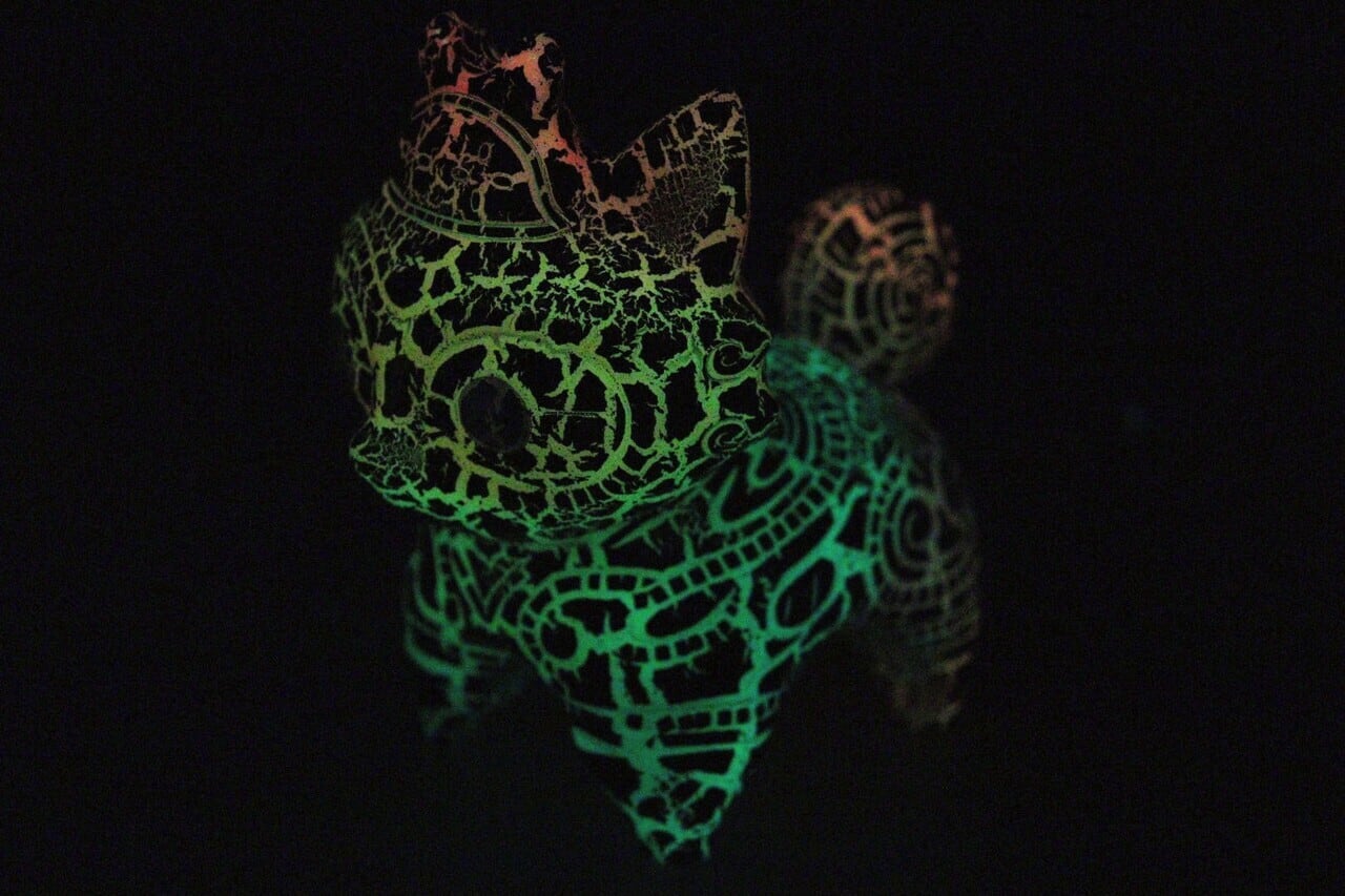 ラメをまとった黒い肌、そのヒビ割れから覗くレインボーカラー。暗い場所ではヒビから7色に発光という神技…ちゃんとドッグゥの模様も浮かび上がっています。ため息が出ます。ドッグゥの新しい一面を創造いただきました。ペインターネット様には改めてお礼申し上げます。