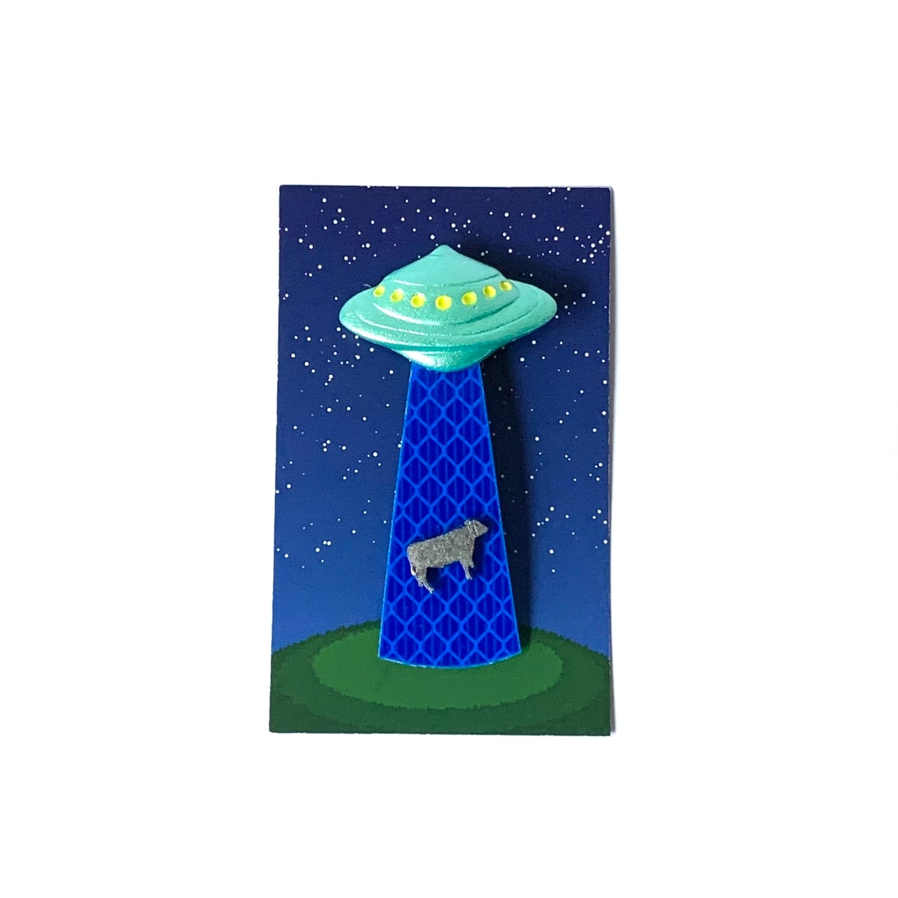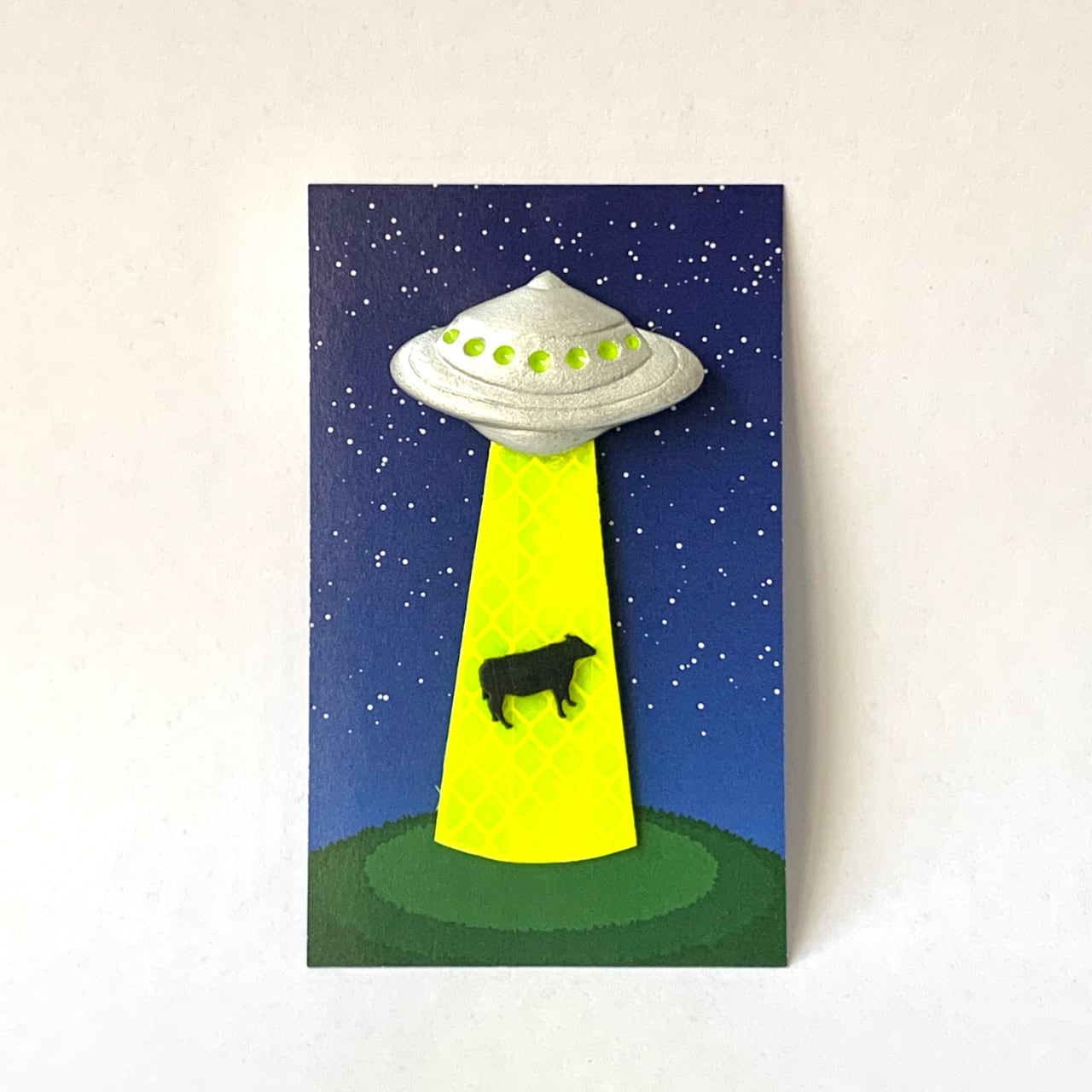 ちまたでよく見かける「UFOが怪しい光で牛を吸い上げる様子」を、高輝度反射板を使ってブローチにしました。デザインは不穏、夜道は安心。