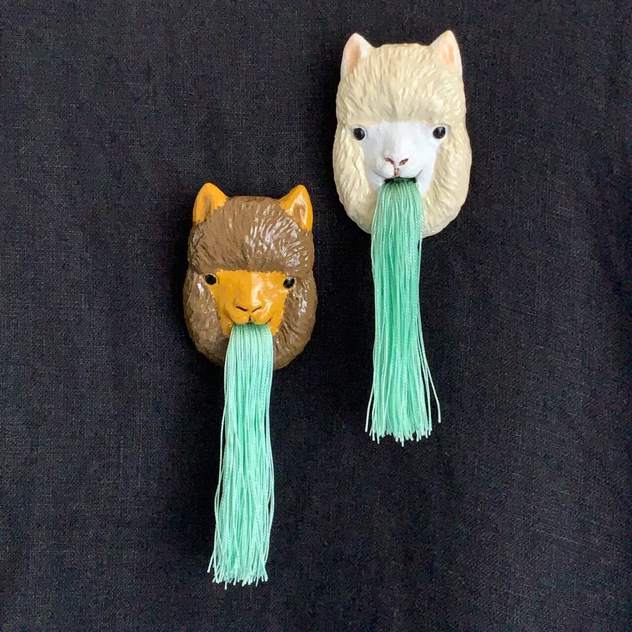 石塑粘土にアクリル絵具・水性ニス・絹糸・金属ピン
